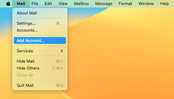 - From the top menu bar, select Mail > Add Account...